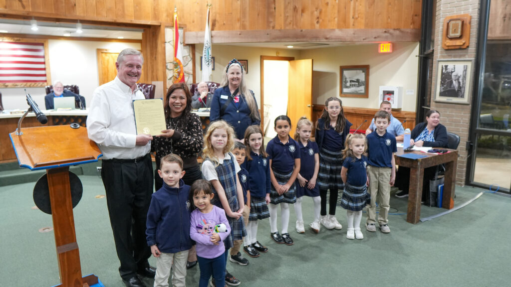 About 15 boys and girls, some in blue-and-gold plaid skirts, all with school crest-emblazoned polos, gather in the back of the city council chambers. The students, all from Holy Family Catholic Academy, wait patiently for about 30 minutes as Mayor Daniel Henkel reads a proclamation recognizing Catholic Schools Week in Niceville from January 25-31.